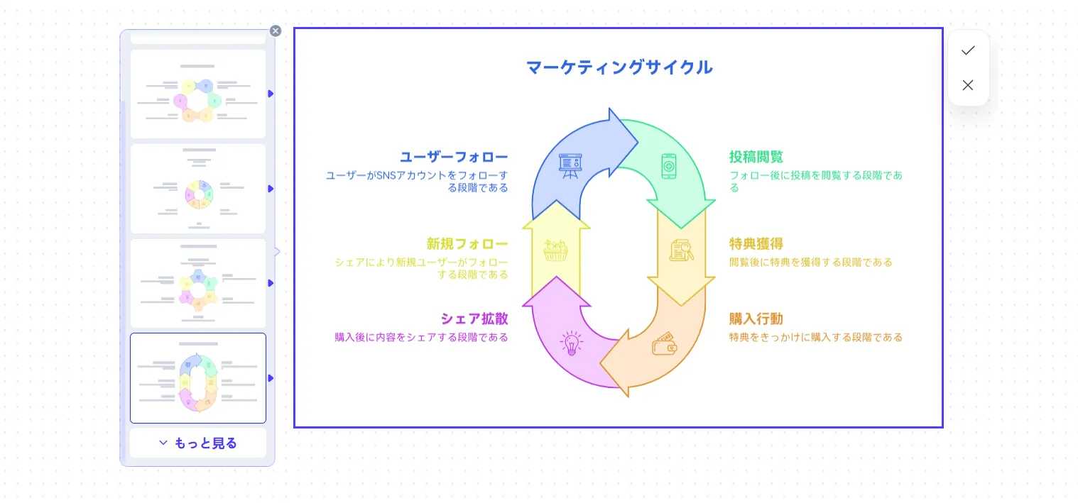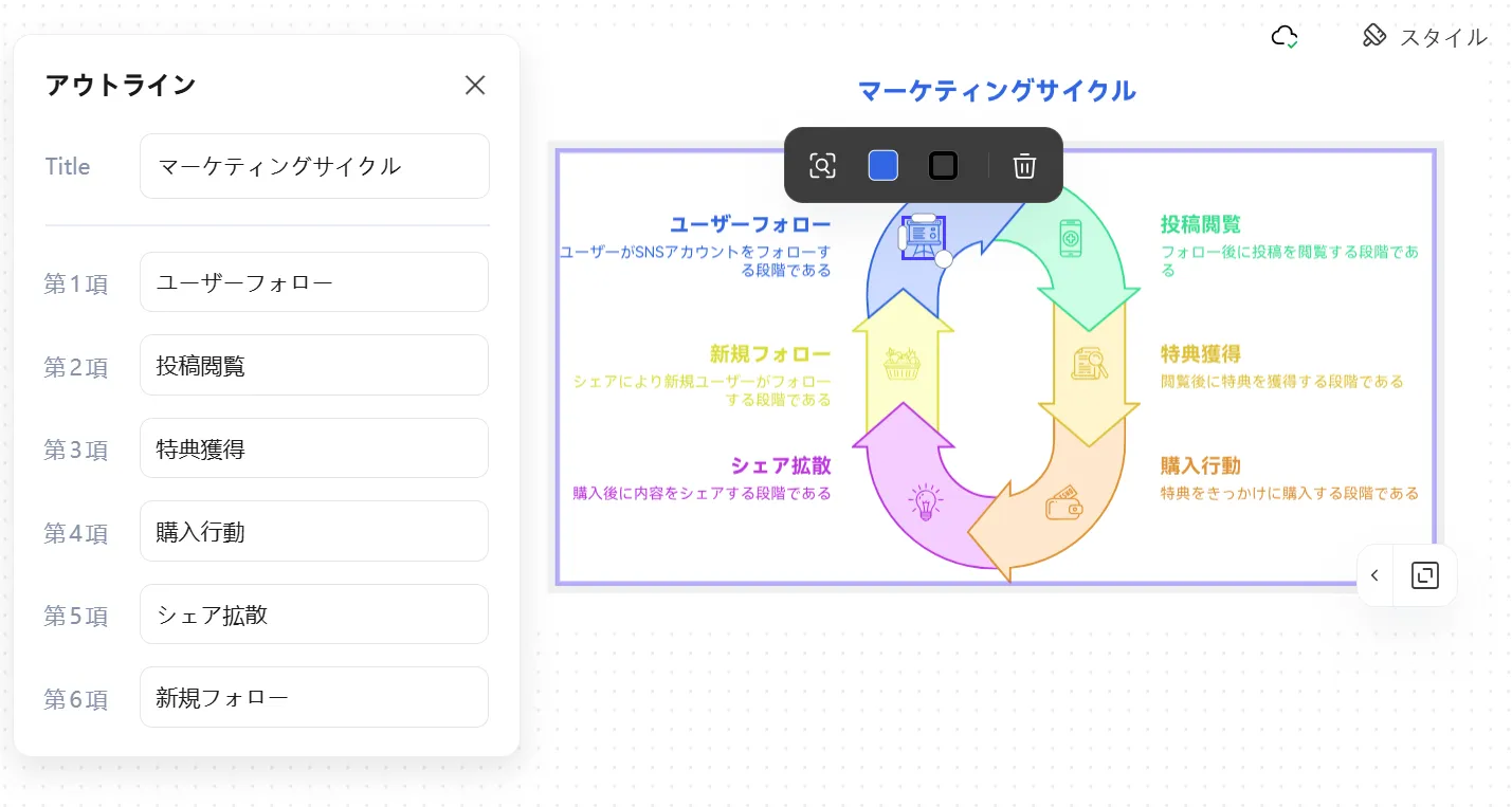 例:「マーケティングサイクル:ユーザーがSNSアカウントをフォロー → 投稿閲覧 → 特典獲得 → 購入 → シェア拡散 → 新規ユーザーのフォロー」