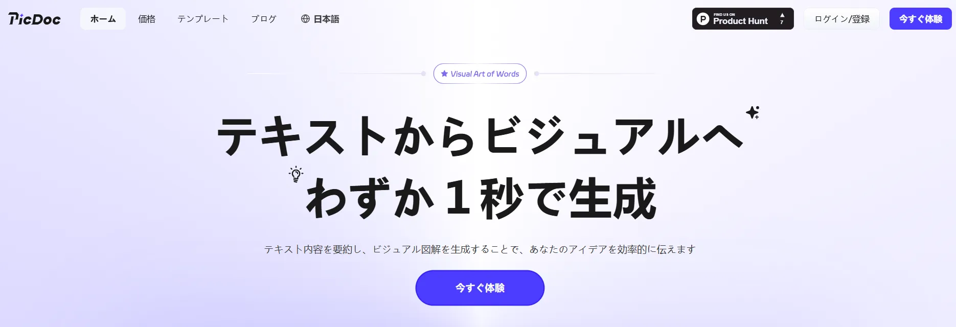 PicDocの公式サイトを開き、トップページにある「今すぐ体験」ボタンをクリックして、生成ページへ進みます。