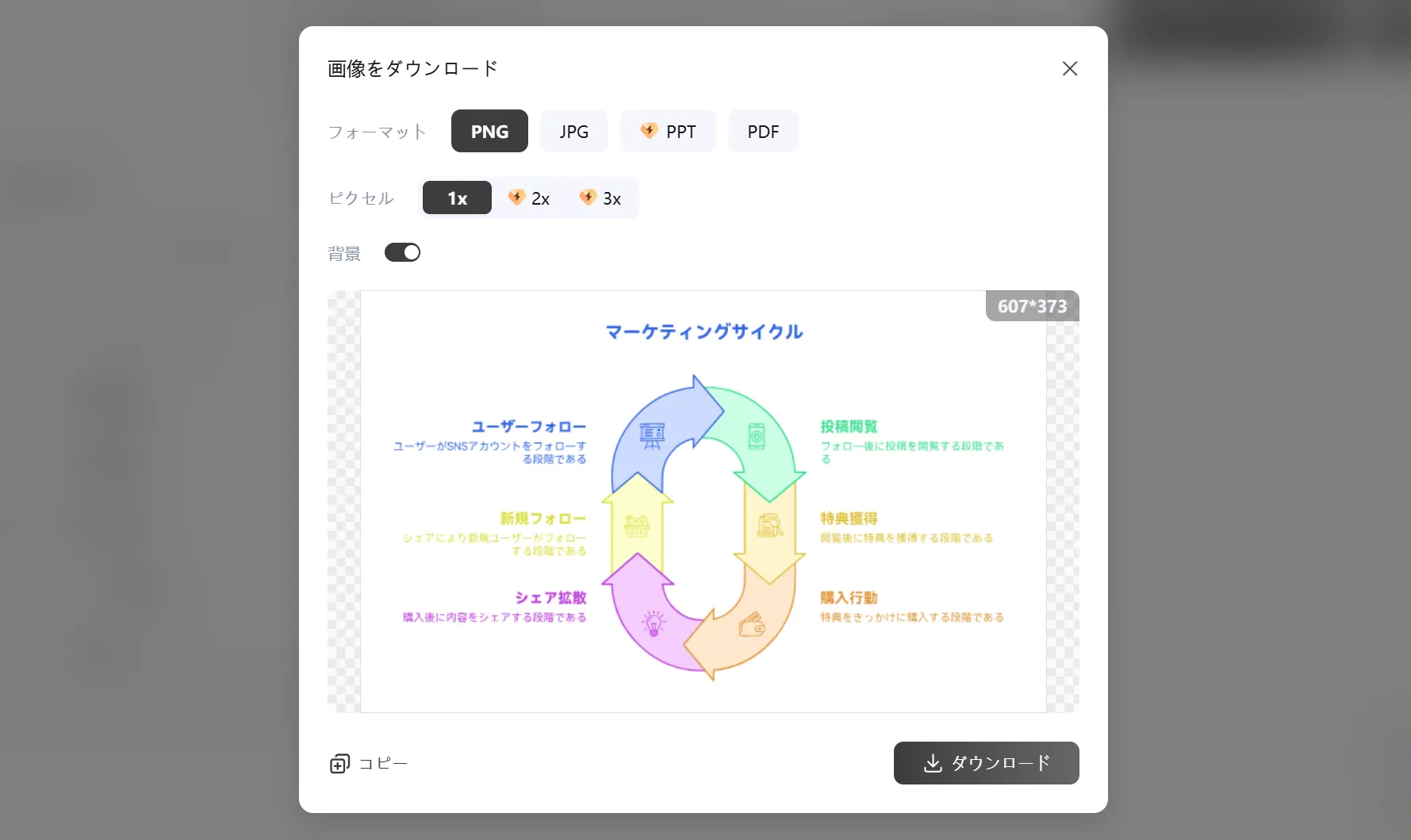 サイクル図の内容を確認したら、「ダウンロード」をクリック。PNG、PDF、PPTなどの形式が選べるので、プレゼン資料・レポート・SNS投稿にすぐ活用できます。