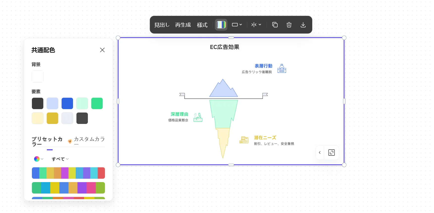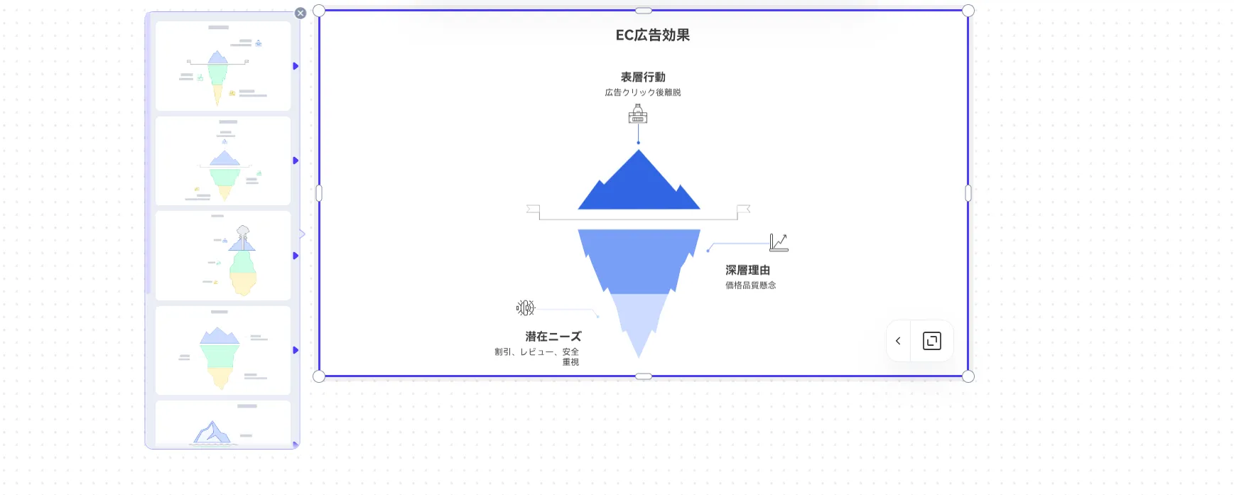 PicDoc を使う場合は、「再生成」機能で複数の氷山チャートテンプレートをプレビューできます。テキスト内容はそのまま保持されるため、デザインを試しながら効率よく仕上げることが可能です。