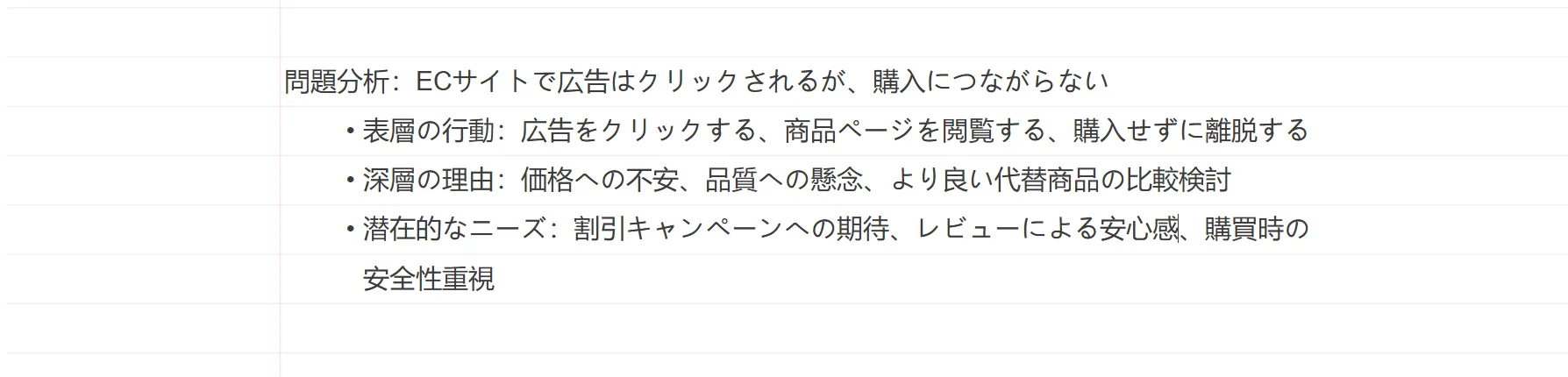 - 深層の理由:価格への不安、品質への懸念、より良い代替商品の比較検討