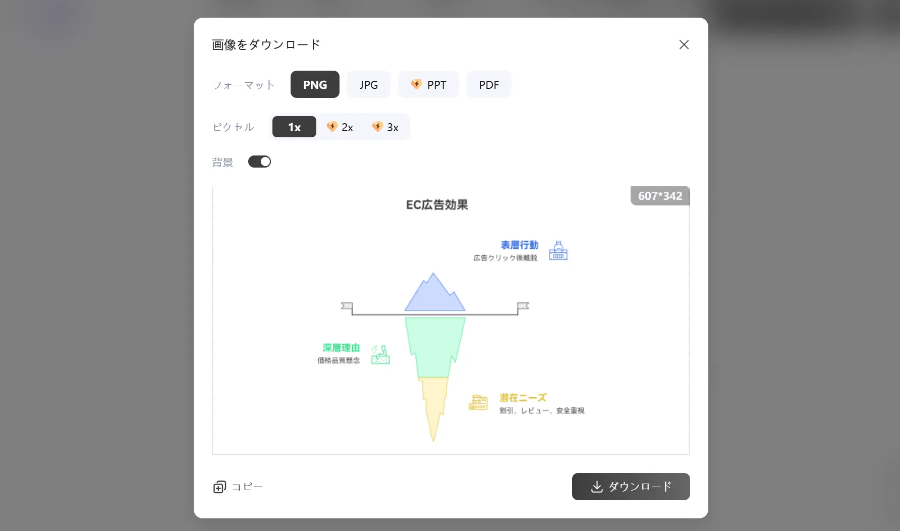 編集が完了したら、ツールバーの「ダウンロード」ボタンから PNG、PDF などの形式を選択します。保存した氷山チャートは、資料作成、レポート、マーケティング用コンテンツなど、さまざまな場面ですぐ活用できます。