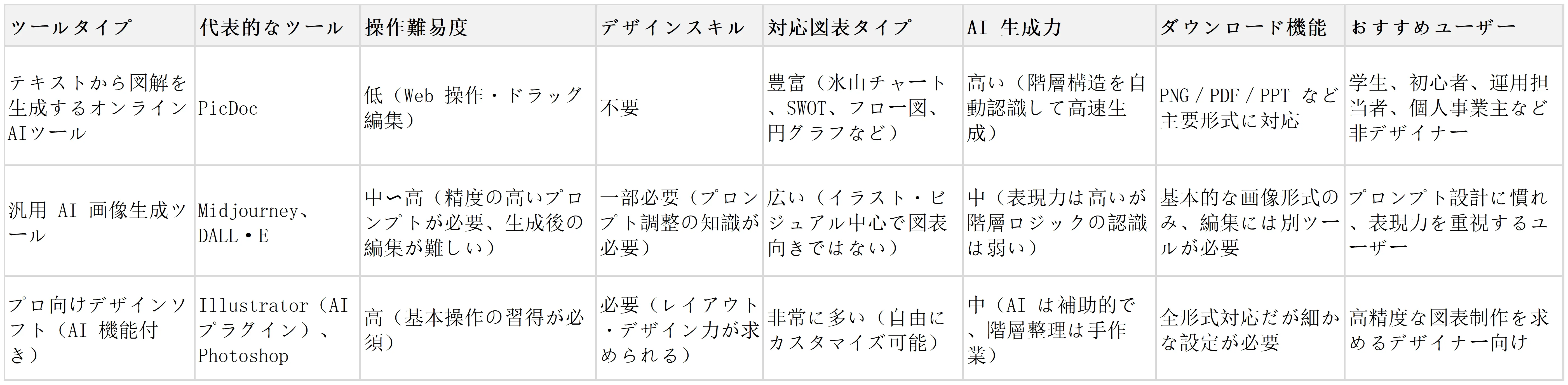デザイン経験のない方にとっては、PicDoc のようなテキストから図表を生成するオンラインAIツールが最もバランスの取れた選択肢です。操作のしやすさ、図表の分かりやすさ、生成後の編集自由度を兼ね備えています。