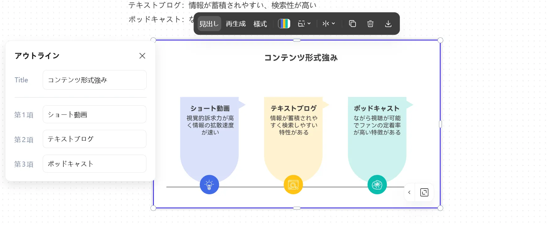 生成されたインフォグラフィックに対して、フォントサイズ・配色・アイコンなどを調整したい場合は、要素をクリックするだけで変更できます(図全体、または特定要素を選択すると編集パネルが表示されます)。テキスト内容を修正したい場合は、ダブルクリックで直接編集するか、「アウトライン」から項目の順序を調整できます。