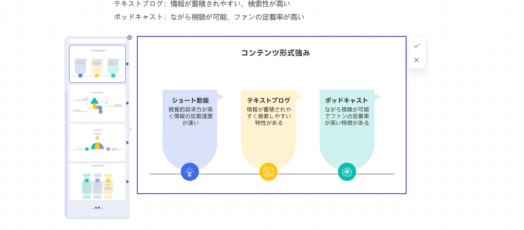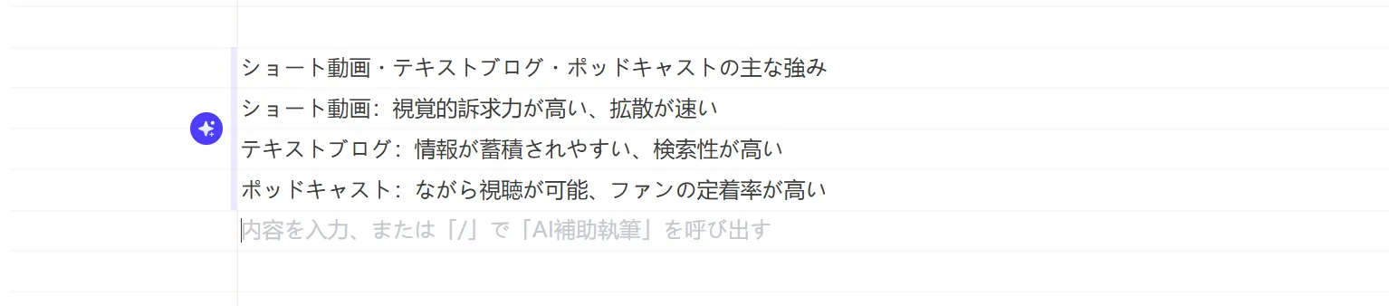例:「ショート動画・テキストブログ・ポッドキャストの主な強み。ショート動画:視覚的訴求力が高い、拡散が速い。テキストブログ:情報が蓄積されやすい、検索性が高い。ポッドキャスト:ながら視聴が可能、ファンの定着率が高い」