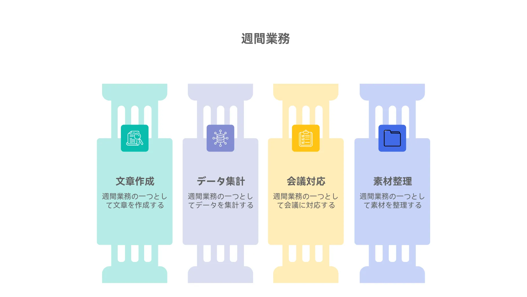 身近な例として、ビジネスパーソンが「週間業務の整理」を行う場面を考えてみましょう。「文章作成」「データ集計」「会議対応」「素材整理」といった複数の業務内容を並列で示したい場合、テキストだけで書くよりも、リスト型インフォグラフィックで表現したほうが、直感的で理解しやすくなります。