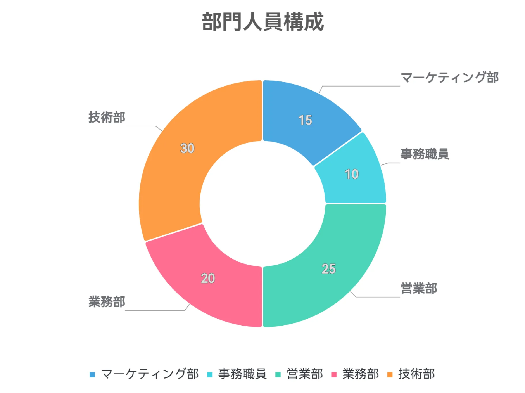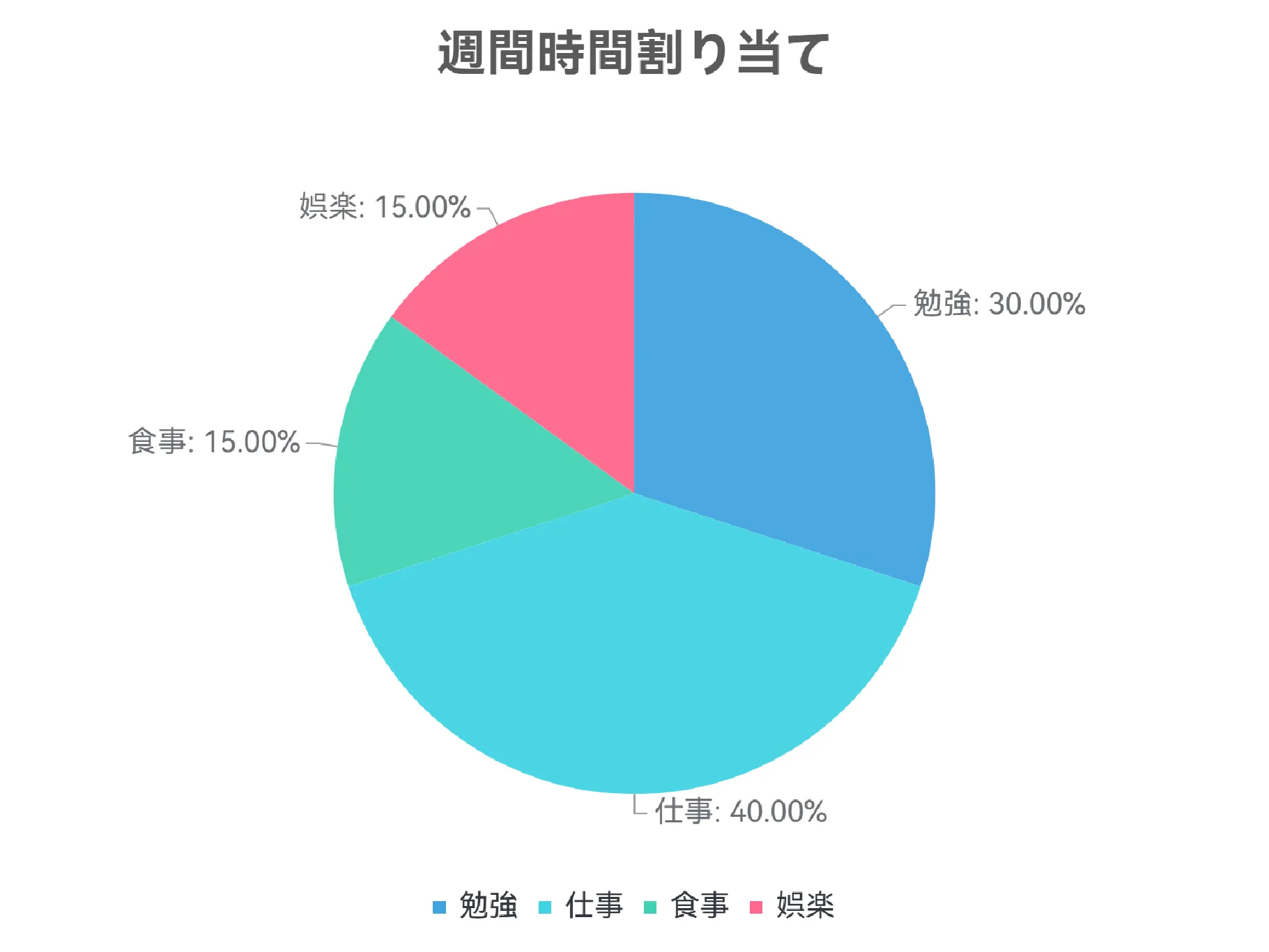 表現品質の向上:初心者が陥りがちな「色が多すぎて見づらい」「ラベルが重なる」といった問題を回避できます。AI は「低彩度かつ高い識別性」を基準に配色し、ラベル位置も自動調整します。各セグメントの割合と数値はこれで、一目で理解できます。