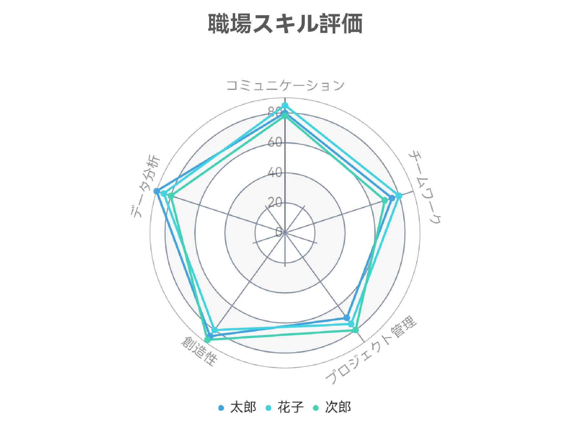 レーダーチャートは「スパイダーチャート」とも呼ばれ、複数の評価軸をもとに、対象同士の強み・弱みを視覚的に比較できる点が大きな価値です。