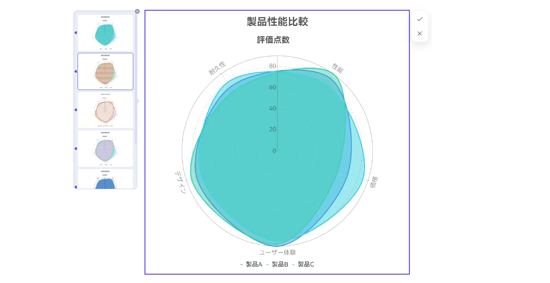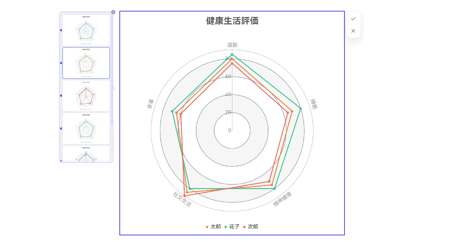 1〜3分でレーダーチャートを作成でき、データ修正時も最初から作り直す必要はありません。編集パネルで編集するだけで、グラフが即座に更新されます。