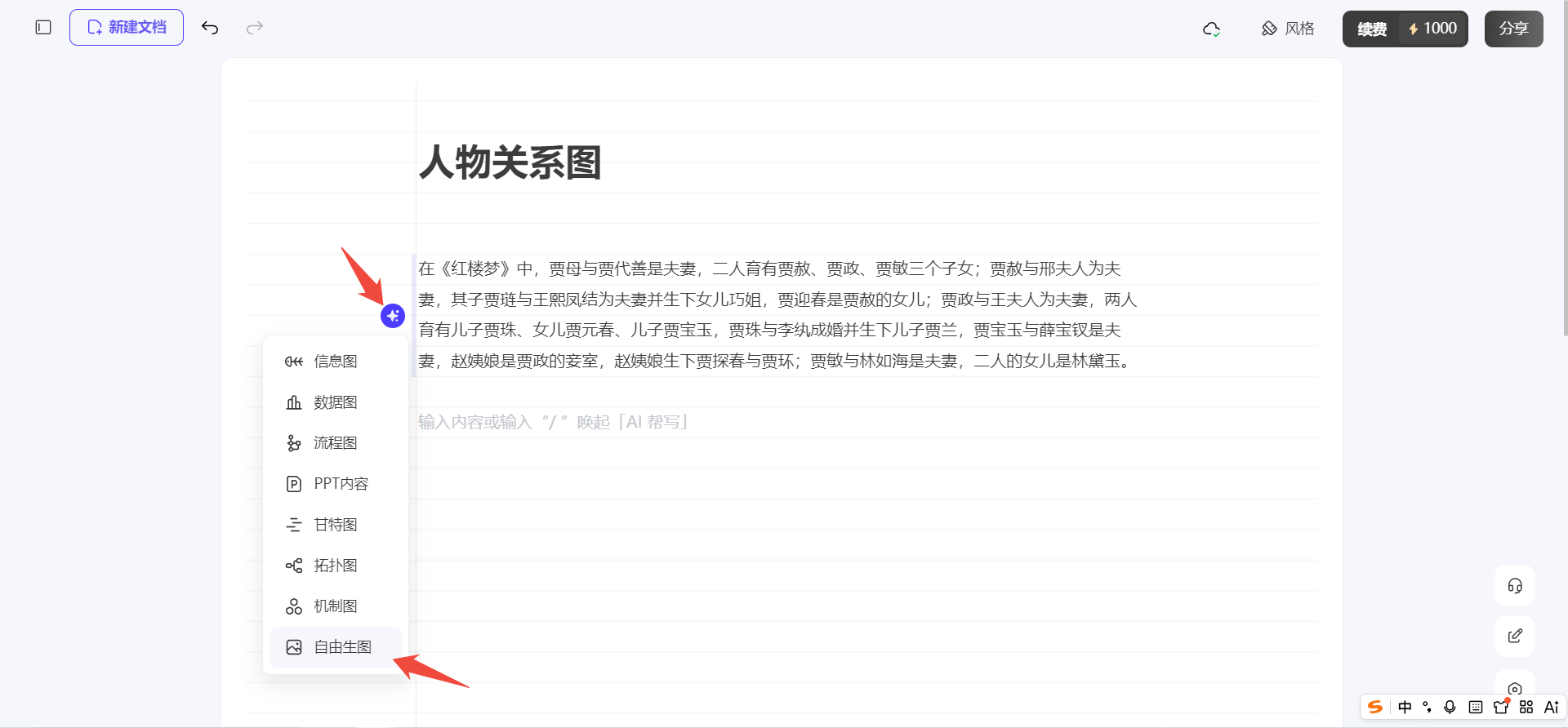 2、ペーストによる生成:PicDocを開き、テキストを貼り付け、生成ボタンをクリックして「フリーハンド画像」を選択してください。