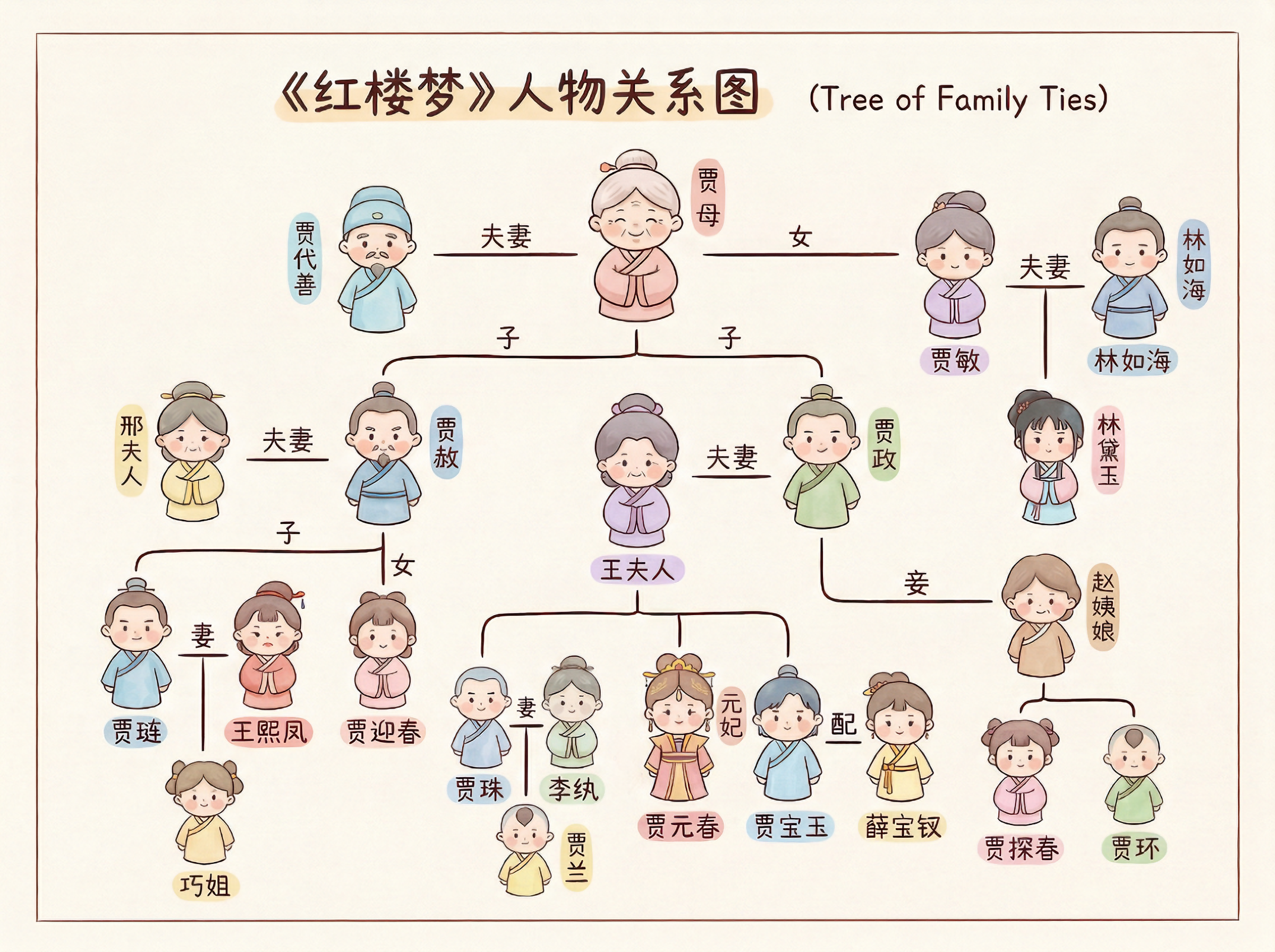 Prompt: 結婚関係を示す線でつながったキャラクター関係図を生成してください。かわいいQ版手描きスタイルを使用してください:賈母と賈代善は結婚し、3人の子供(賈赦、賈政、賈敏)を持っています。賈赦と邢夫人は結婚し、息子の賈璉は王熙鳳と結婚し、娘の巧姐を持っています。賈迎春は賈赦の娘です。賈政と王夫人は結婚し、3人の子供(賈珠、賈元春、賈宝玉)を持っています。賈珠は李紈と結婚して賈蘭を生み、賈宝玉は薛宝釵と結婚しています。趙姨娘は賈政の側室で、賈探春と賈環を生みました。賈敏と林如海は結婚し、娘は林黛玉です。
