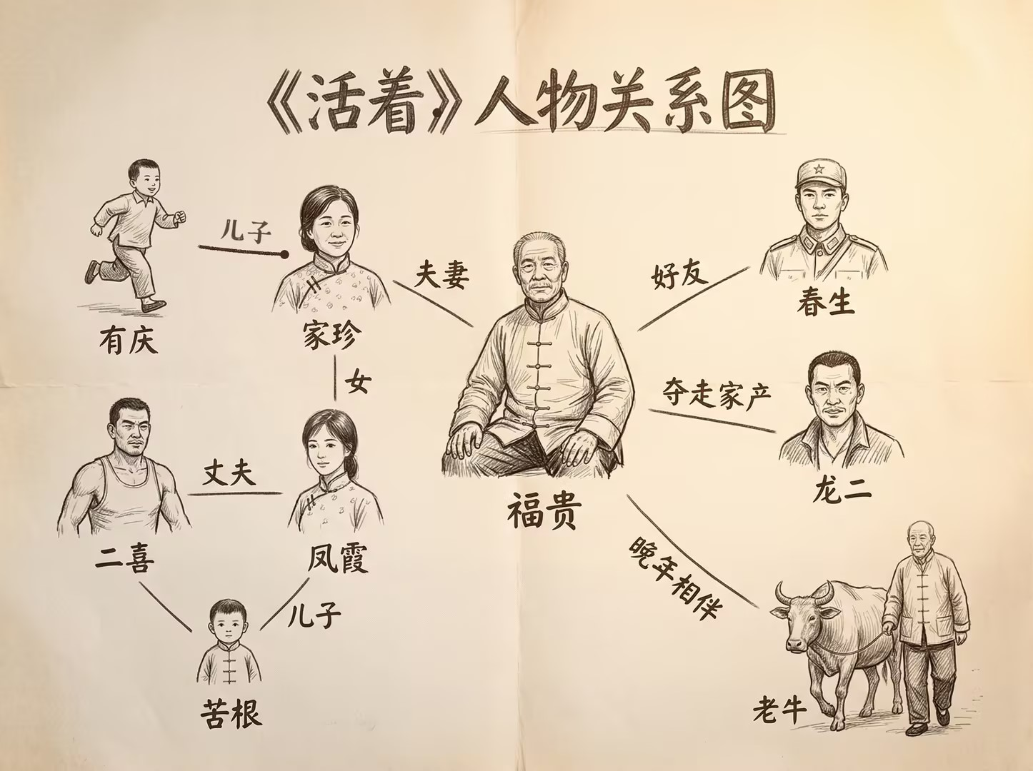 Prompt: 手描きスタイルのキャラクター関係図を生成してください。福貴と家珍は結婚し、2人の子供(有慶と鳳霞)を持っています。娘の鳳霞は二喜と結婚し、息子は苦根です。福貴には親友の春生がいて、命を共にする絆で結ばれています。春生はかつて賭けの相棒である龍二に家財をすべて盗まれました。晩年には老いた牛と友達になりました。