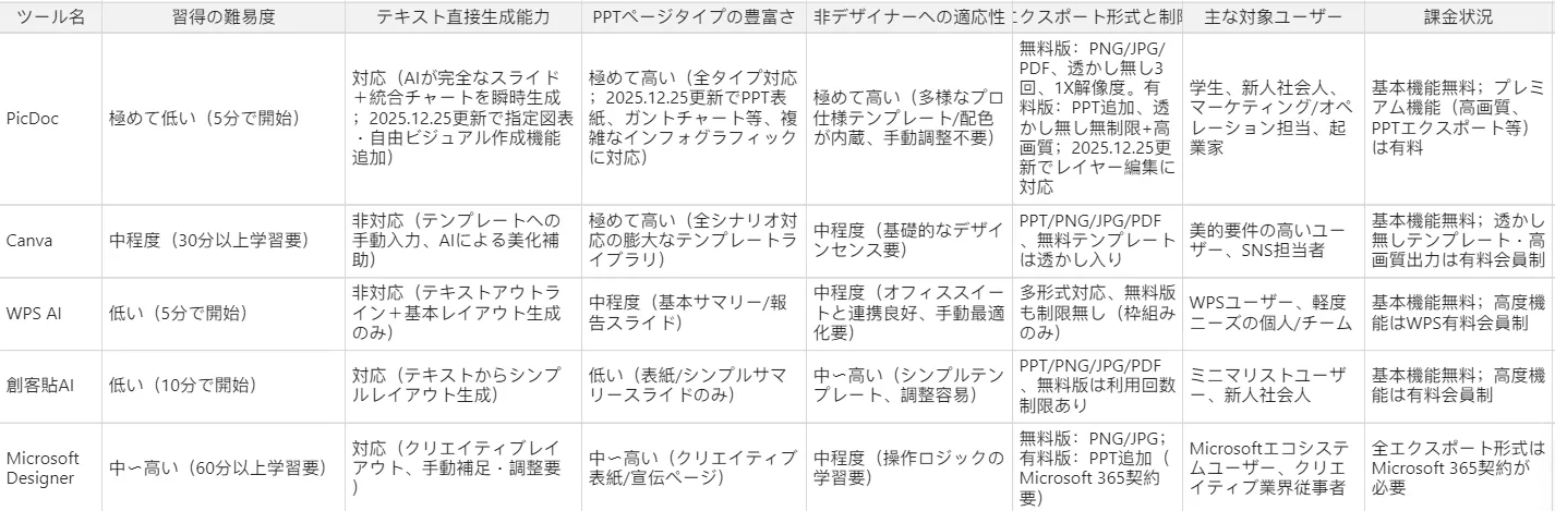 - 適応するユーザー層とシーン:ツールの核心的に適応するユーザー層(学生/社会人/運営担当/起業家)と、核心的な使用シーン(レポート発表/ビジネス報告/製品紹介/企画立案)を明確にします。