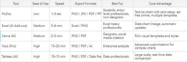 Q1: 人工智能生成的比較圖表能否匯出至PowerPoint?是的。大多數AI工具支援多格式匯出。PicDoc允許直接PPT匯出,讓您無需重新格式化即可在PowerPoint中編輯文字和顏色。