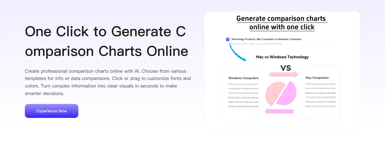 使用AI生成比較圖表可以完全消除手動格式化和無休止顏色調整的挫折感。無論您是比較部門績效、產品規格還是學生測試成績,只需粘貼文本即可在幾秒鐘內生成乾淨、專業的圖表,隨時可用於演示文稿或作業。