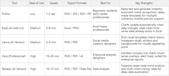 傳統工作流程要求您首先整理時間序列數據,手動插入折線圖,然後微調樣式和坐標軸—這通常需要30分鐘或更長時間。另一方面,AI工具會自動處理數據解析→趨勢識別→視覺優化,這使得它們在以下情況下特別有用: