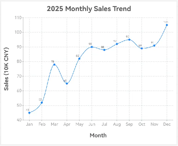 - 邏輯解釋:自動將時間/維度分配到X軸(例如,「一月、二月」),將數值分配到Y軸(例如,「500單位、650單位」),生成帶有數據標籤的平滑趨勢線。