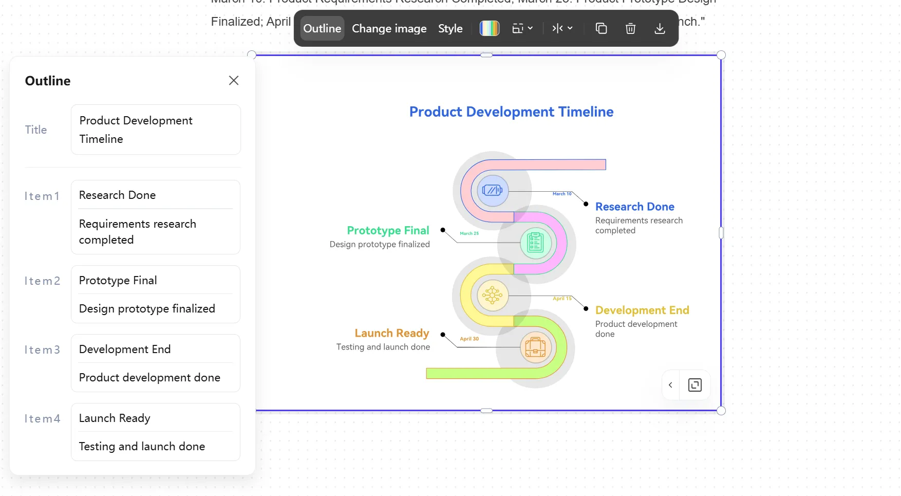 A4:是的,您可以。使用 PicDoc 生成時間軸後,您可以自訂顏色、字體、圖示和範本樣式。只需點擊元素即可進行調整。