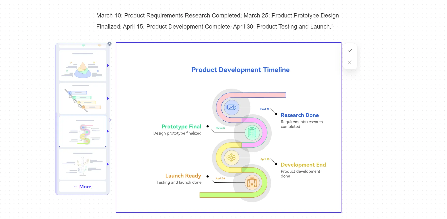 例如,如果你正在建立一個「產品發布進度時間表」,你需要具體的時間點,如:3月10日(需求研究完成)、3月25日(原型設計定稿)、4月15日(開發完成)和4月30日(測試與發布)。你的時間序列列表越清晰、越有順序,最終生成的結果就會越好。