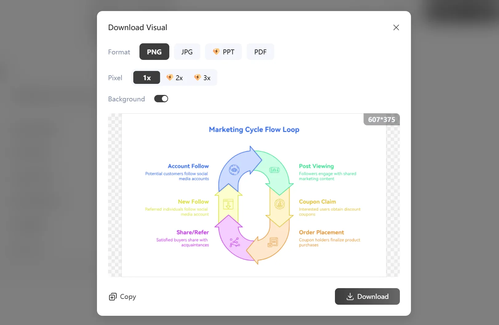 一旦您確認循環圖正確無誤,請點擊「下載」並選擇PNG、PDF或PPT等格式,以便直接用於演示文稿、報告或社交媒體帖子。