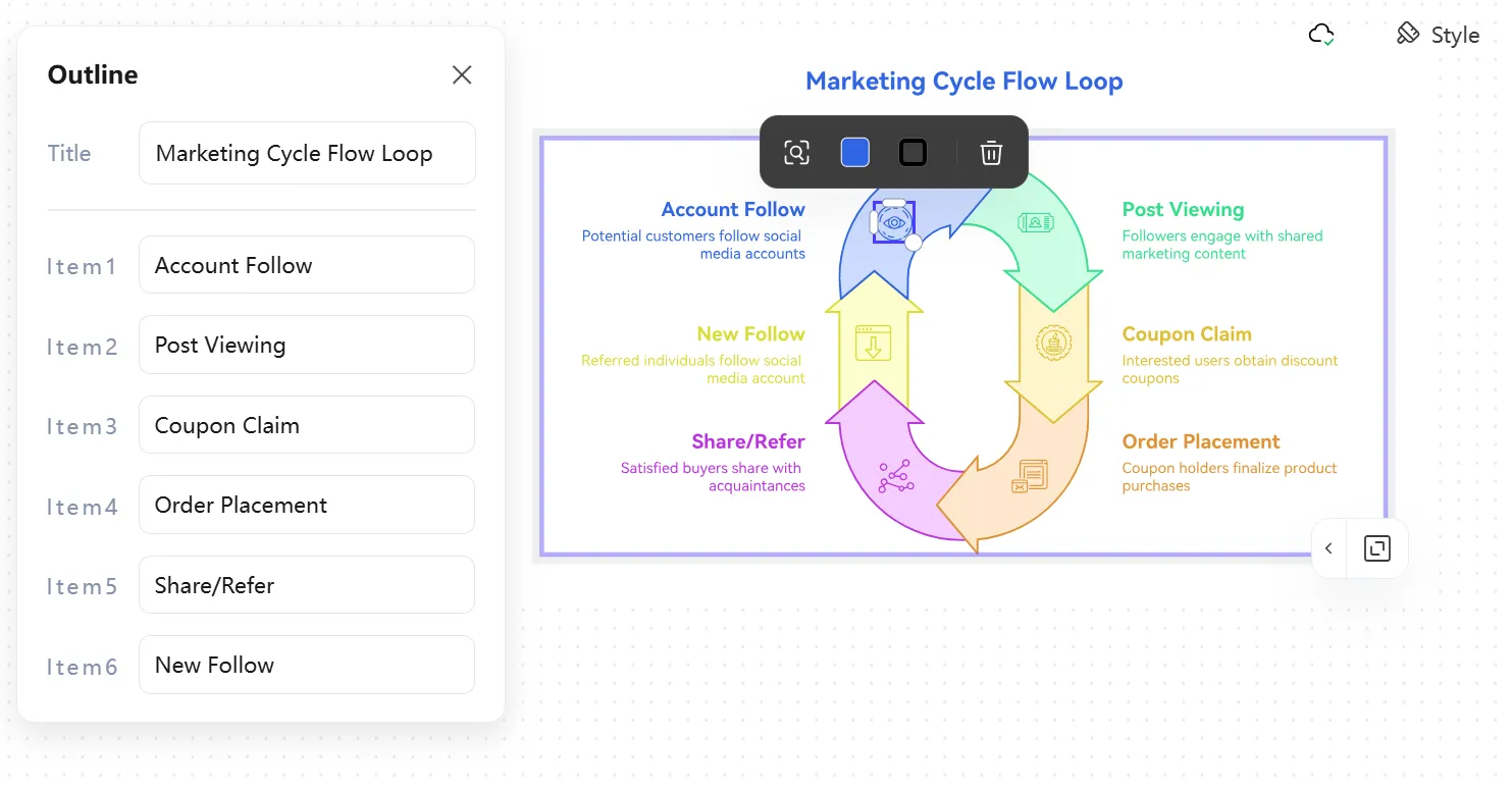 點擊「生成」按鈕,AI將在幾秒鐘內自動創建循環圖。如果您對節點樣式或配色方案不滿意,可以點擊進行調整,或通過編輯選項應用預設模板樣式。您也可以使用「大綱」功能或雙擊節點來修改文本。