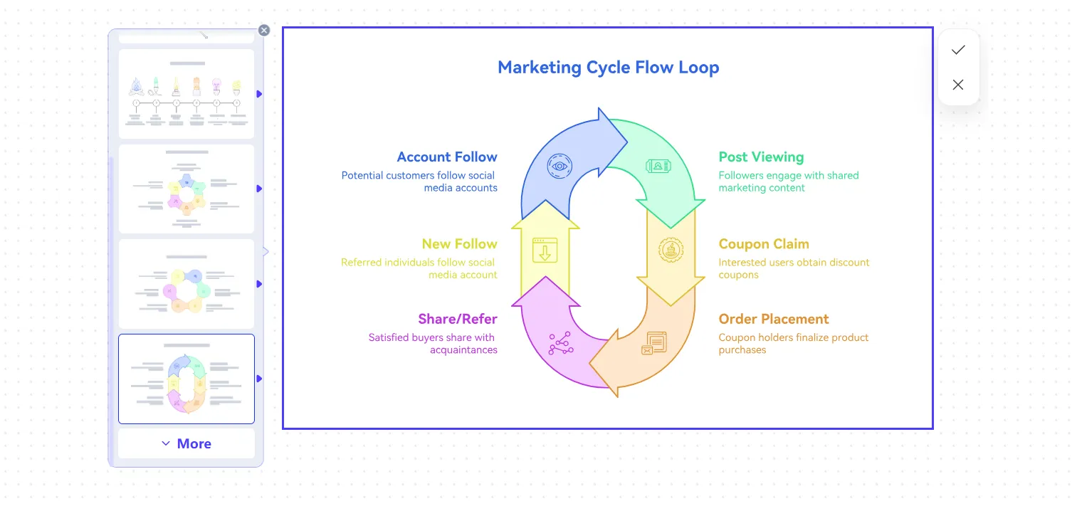 使用AI生成循環圖可以幫助您在10分鐘內製作出專業級效果。無論您需要用於項目管理的流程循環、用於營銷的用戶轉化漏斗,還是用於教育知識, AI 讓您能夠快速創建它,顯著減少設計和修訂時間。