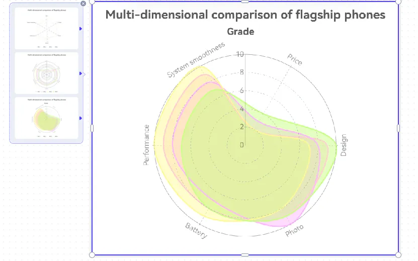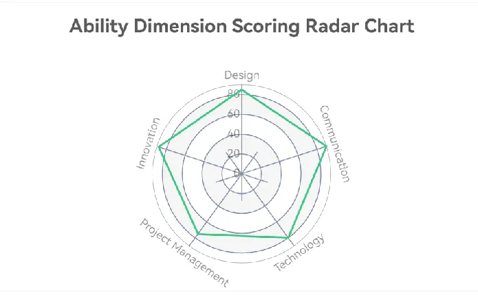 AI生成的雷達圖解決了傳統手動創建的長期痛點:難度高、效率低和結果不一致。只要您清楚定義維度和數據,像PicDoc雷達圖這樣的工具就能讓您在幾分鐘內生成專業的雷達圖,隨時可用於報告、作業或決策演示。