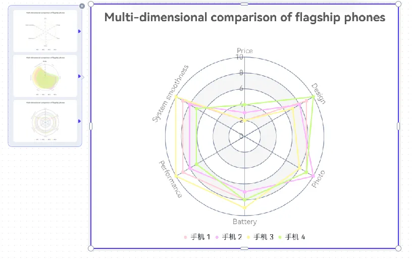 雷達圖是多維數據比較的優秀視覺工具,能使複雜的橫向對比信息直觀易懂。更重要的是,借助AI工具,無需任何設計經驗,10分鐘即可製作出專業且符合場景的雷達圖,適用於多種使用場景。