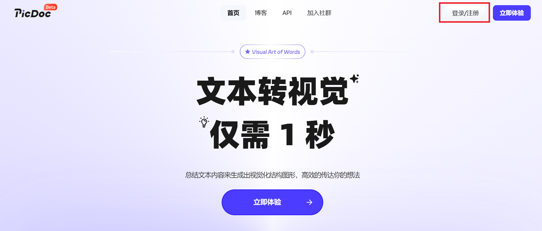 首先,在PicDoc的官方網站上,點擊“登錄/註冊”,使用微信或手機號進行註冊或登錄。登錄後,點擊“立即體驗”,即可開始使用PicDoc。